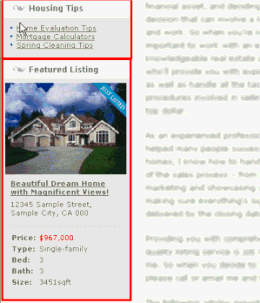 Including short informational text, such as buying and mortgage tips, or quick links, such as your top 5 listings, is an efficient way to engage your customers. This information is organized into individual Web boxes and can appear either on the left or the right side of your page. The exact location depends on the theme that you chose for your site.